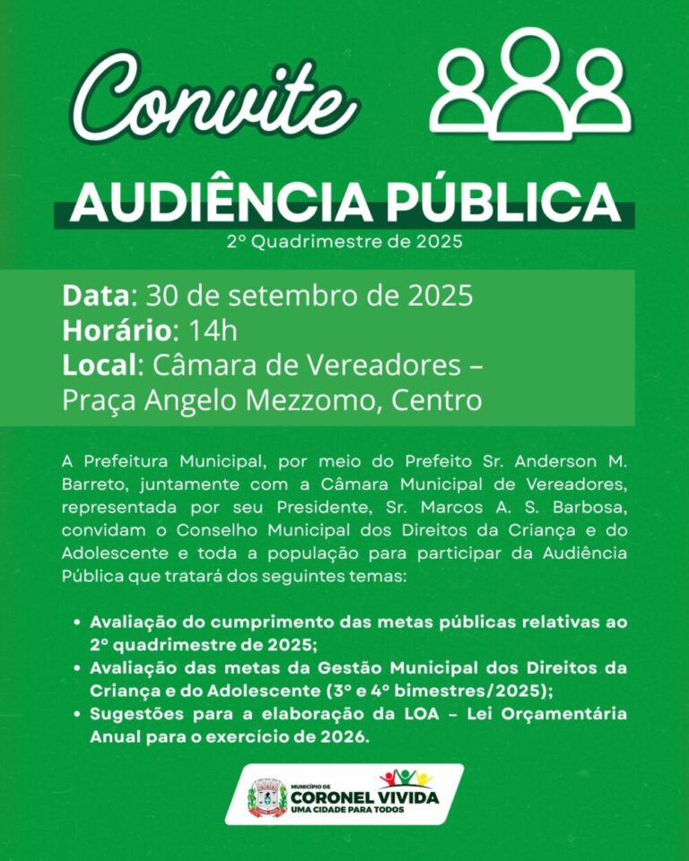 No próximo dia 30 de setembro, a partir das 14h, teremos duas audiências públicas. As 14h, haverá Avaliação do Cumprimento das metas Públicas relativas ao 2º Quadrimestre de 2025, das metas da Gestão Municipal dos Direitos da Criança e do
