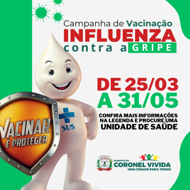 A Prefeitura de Coronel Vivida tem o prazer de anunciar a Campanha de Vacinação contra a Influenza, que ocorrerá no período de 25 de março a 31 de maio de 2024. O objetivo desta campanha é claro: reduzir as complicações,