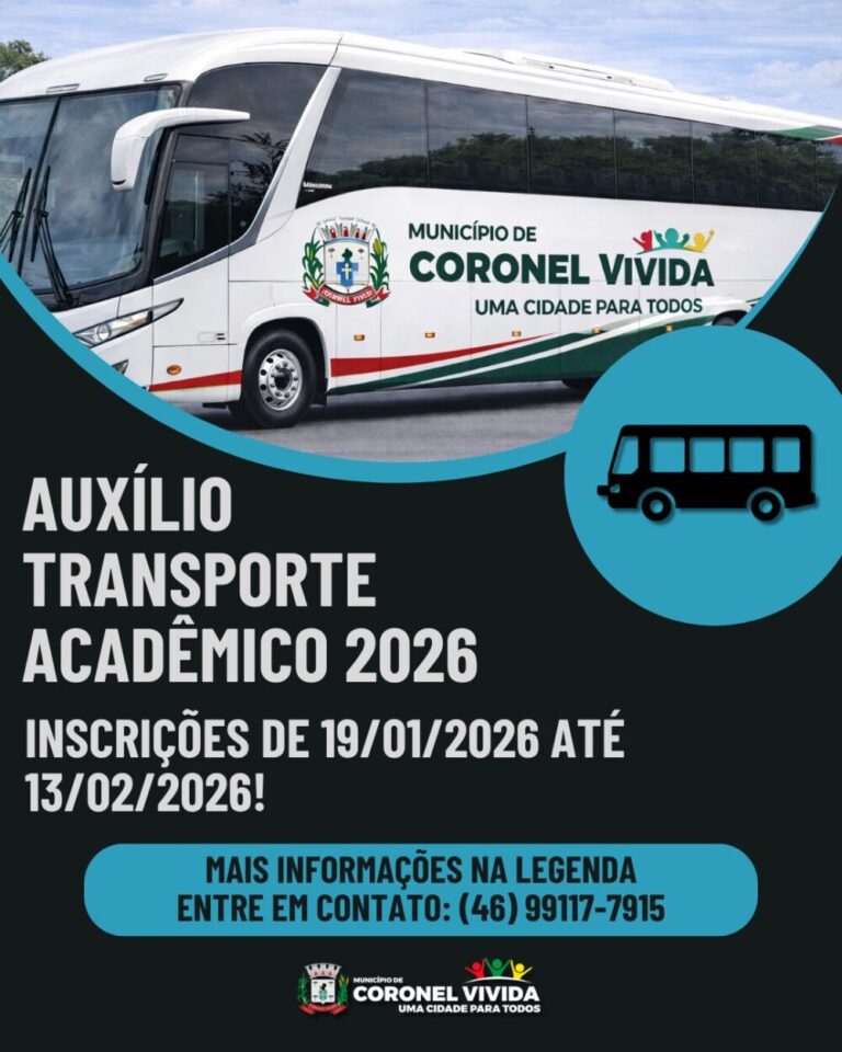 As inscrições para os alunos que desejarem adquirir o auxílio transporte acadêmico para o 1º semestre de 2026, iniciarão no dia 19/01/2026 e vão até o dia 13/02/2026. exigindo cadastro pelo Site do Município no link abaixo. https://coronelvivida.1doc.com.br/b.php?pg=wp/wp&itd=5&iagr=2621 É necessário: