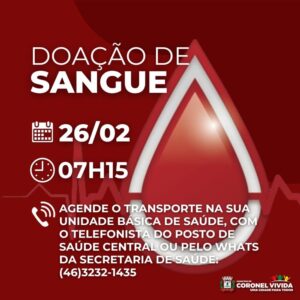 Se você está entre as pessoas que reúnem estas condições e quer ser doador, no dia 26 de fevereiro teremos transporte para o Hemonúcleo de Pato Branco. Lembrando que a saída será às 07h15.