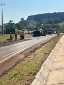 Há barreiras na rodovia Prefeito Ivo Feiten, PR-562, onde há uma equipe fazendo recapeamento asfáltico.