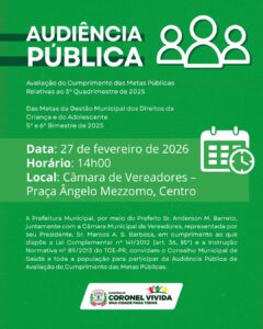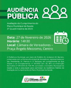 Logo após, às 14h30, haverá nova audiência pública, desta vez, para tratar da avaliação do cumprimento do Plano Municipal de Saúde, referente ao 3º quadrimestre de 2025.