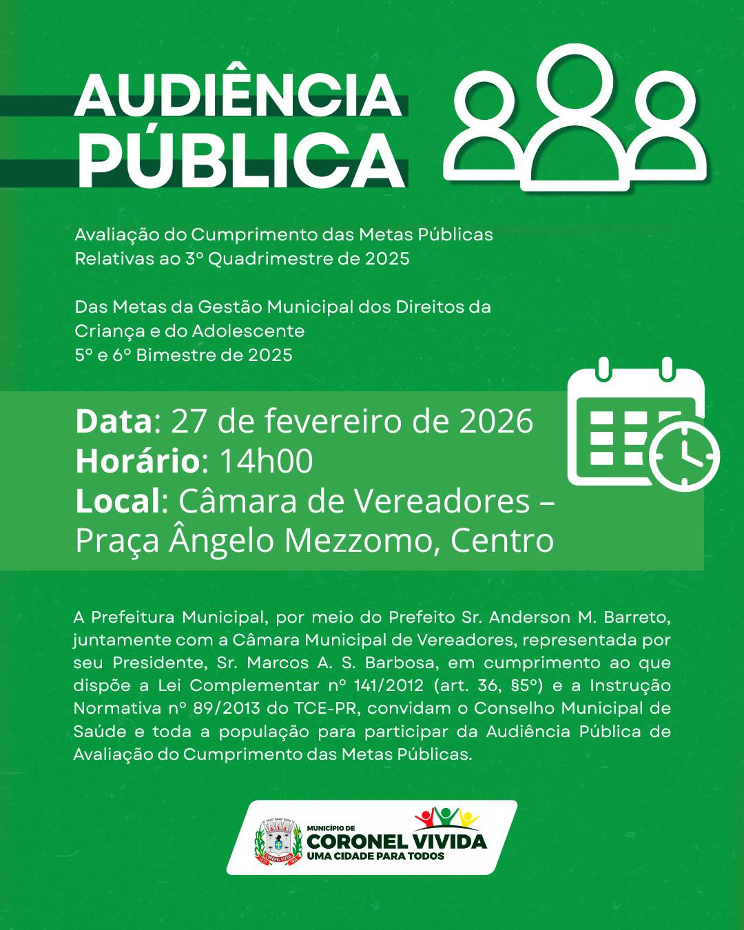 Na próxima sexta-feira, 27 de fevereiro, na Câmara Municipal de Vereadores, a partir das 14h, haverá audiência pública para tratar do cumprimento das metas da gestão municipal.