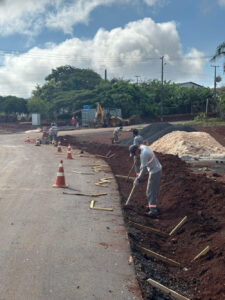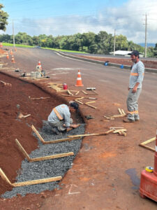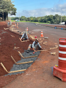 As obras no Parque Industrial Olímpio Vanzin ainda não terminaram. Na manhã desta quinta-feira, a equipe de trabalho foi dividida em duas frentes. Uma delas concentrou-se na construção de canaletas, que servem para levar a água das chuvas até a tubulação de galerias de águas pluviais, evitando assim que acumule água no asfalto, causando erosão e deteriorando o pavimento.
