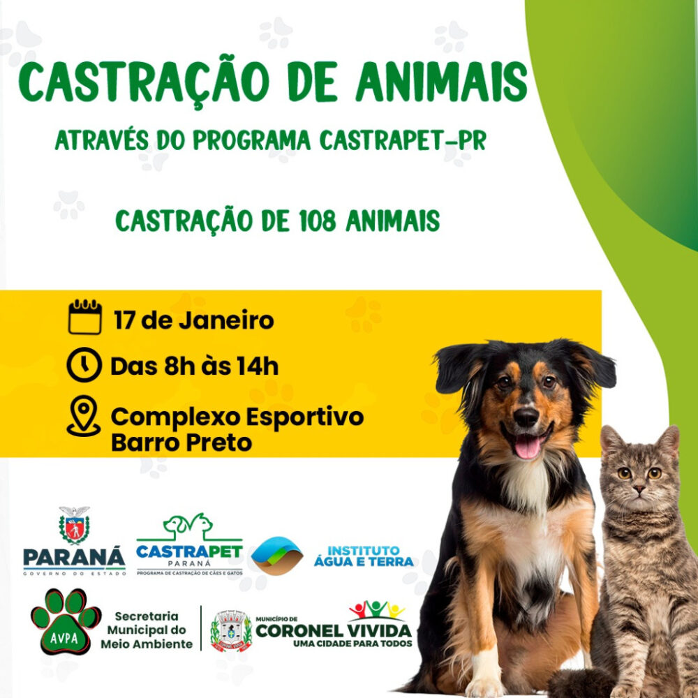 O Município de Coronel Vivida, em parceria com o Governo do Estadodo Paraná e o Instituto Água e Terra (IAT), realizará no dia 17 de janeiro, a castração de animais através do Programa Castrapet-PR, que prevê a castração de cães e gatos.