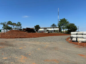 As obras da marginal na rodovia PR-562 seguem em ritmo acelerado. Nesta semana, conforme as cargas de “pedra rachão” vão chegando, as máquinas vão espalhando a carga em toda a extensão da obra e fazendo a sua compactação. A pedra rachão, junto com outros componentes são essenciais para a construção de uma base sólida.