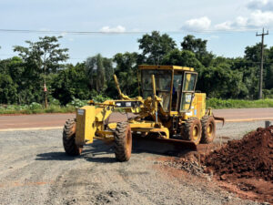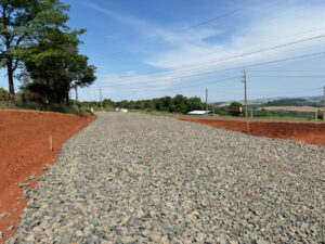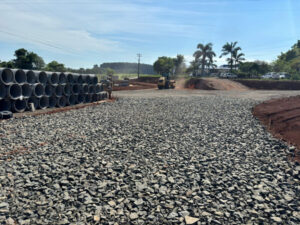 As obras da marginal na rodovia PR-562 seguem em ritmo acelerado. Nesta semana, conforme as cargas de “pedra rachão” vão chegando, as máquinas vão espalhando a carga em toda a extensão da obra e fazendo a sua compactação. A pedra rachão, junto com outros componentes são essenciais para a construção de uma base sólida.
