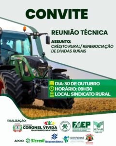 A Administração Municipal de Coronel Vivida, através da Secretaria de Desenvolvimento Rural, juntamente com o Sindicato Rural e Sintraf, convida os produtores rurais do município para participar de uma importante Reunião Técnica com o tema: CRÉDITO RURAL – RENEGOCIAÇÃO DE DÍVIDAS RURAIS.