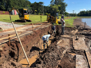 As calçadas começaram a ser implantadas na parte de baixo, onde será construída uma nova entrada, diferente de tudo que vocês podem imaginar. A parte elétrica também já está sendo colocada. As obras continuam para deixar o Lago ainda mais arborizado e aconchegante.