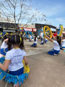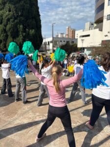 As alunas da oficina de dança da AABB Comunidade, coordenada pela professora Leila do Pilar Biancatto, dançaram um medley com as músicas: Aquarela do Brasil e Brasil olha pra cima.