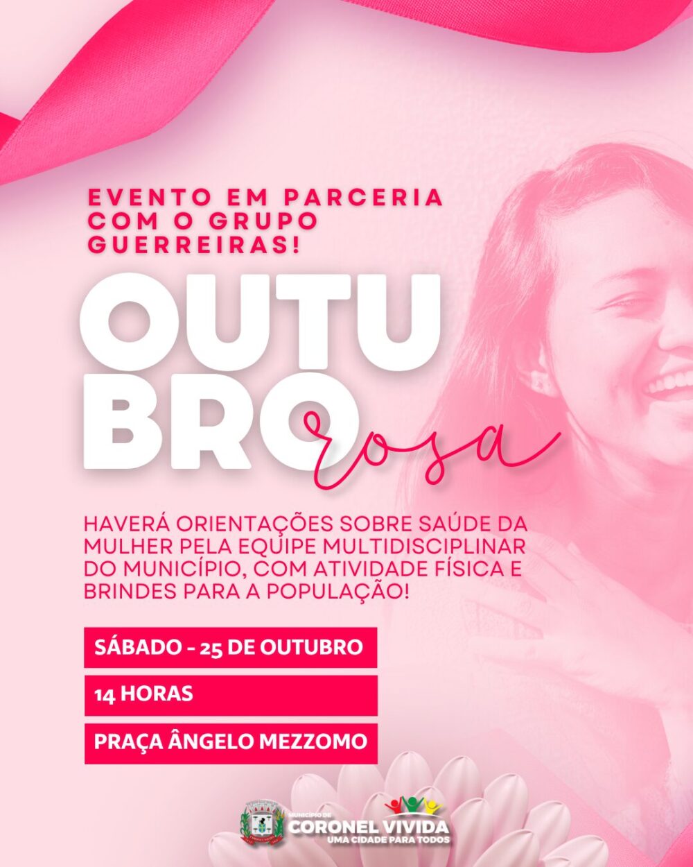 Será realizado no próximo sábado, 25 de outubro, um evento voltado à conscientização sobre o câncer de mama. Será realizado pela Secretaria Municipal de Saúde juntamente do Grupo Guerreiras.