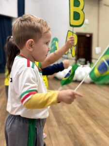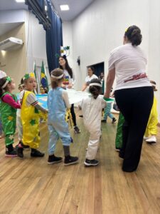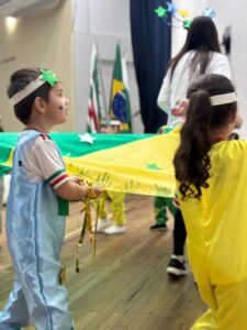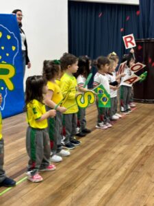 Enquanto isso, a turma do Maternal II, conduzidos pela Professora Vanessa e suas auxiliares Tayane e Elaine, encenaram a música “Nosso Brasil”.