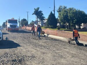 A obra de mais uma etapa da nossa Perimetral Verde e Amarela está em desenvolvimento. Após a conclusão da base, a equipe de trabalho está focada na instalação do meio-fio em um dos lados da via, na altura da entrada para o bairro Sol Nascente.