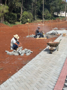 Como você pode ver nas imagens, são três frentes de trabalho: em uma delas, está acontecendo a execução das calçadas em paver. Na outra, os bancos estão sendo instaladas sobre as estruturas construídas recentemente. Por fim, há trabalhadores focados na fiação da iluminação baixa.