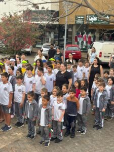 Os alunos do 4º e 5º anos da Escola Municipal Sete de Setembro, coordenados pela Professora Camila Heloise Cardoso Janeczko apresentaram a música Somos, do Dj Alok e do grupo Melin.