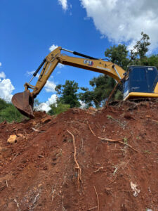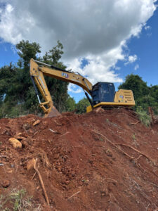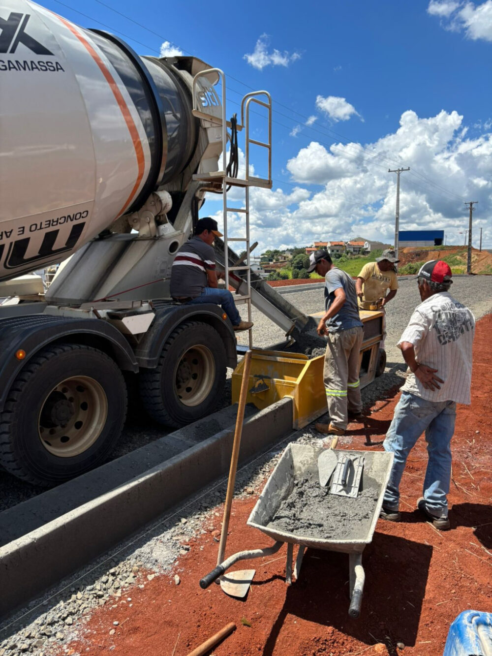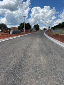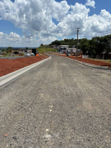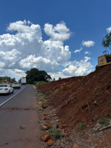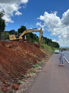 A Perimetral Verde e Amarela continua tomando forma. Enquanto uma equipe trabalha na instalação de meio-fio na futura via, do outro lado da Rodovia BR-373, segue a limpeza do terreno, para que aconteça a equalização com o levantamento topográfico e assim dar continuidade a obra.