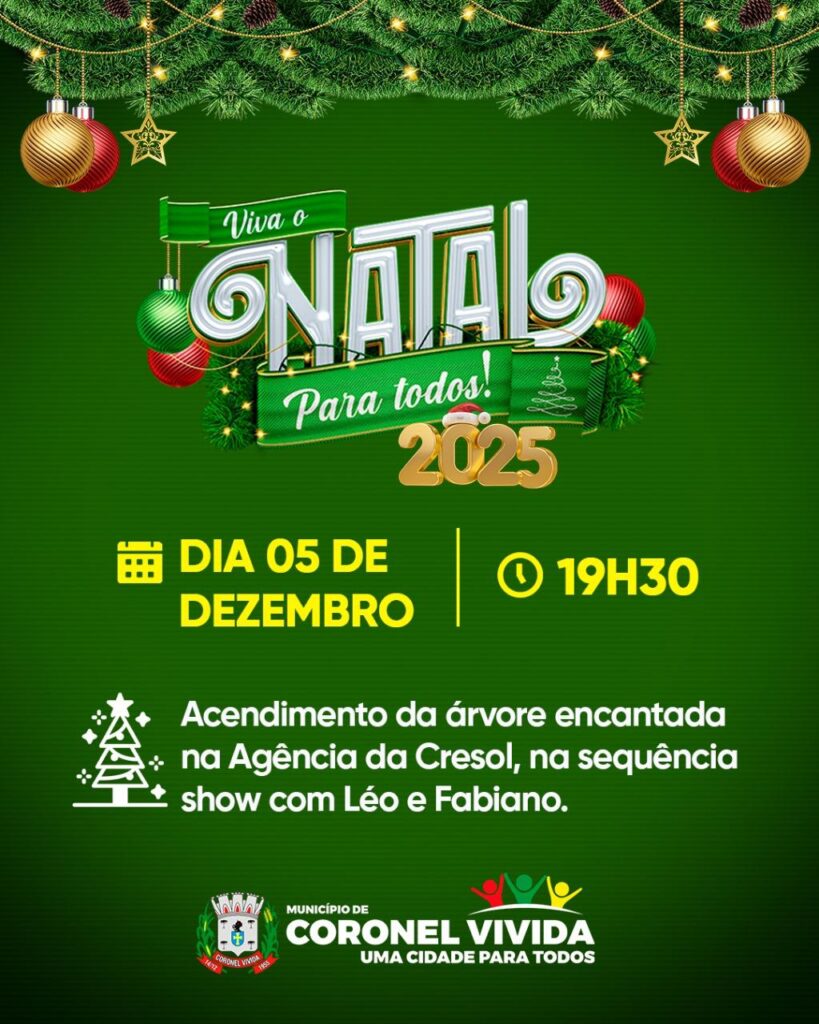 A programação oficial do Natal para Todos 2025 está incrível. Nesta sexta-feira, 5 de dezembro, a partir das 19h30, acontecerá o acendimento da árvore encantada na Agência da Cresol, localizada no entroncamento das ruas Ubaldino do Amaral e das Américas. Após a cerimônia, teremos show com Léo e Fabiano
