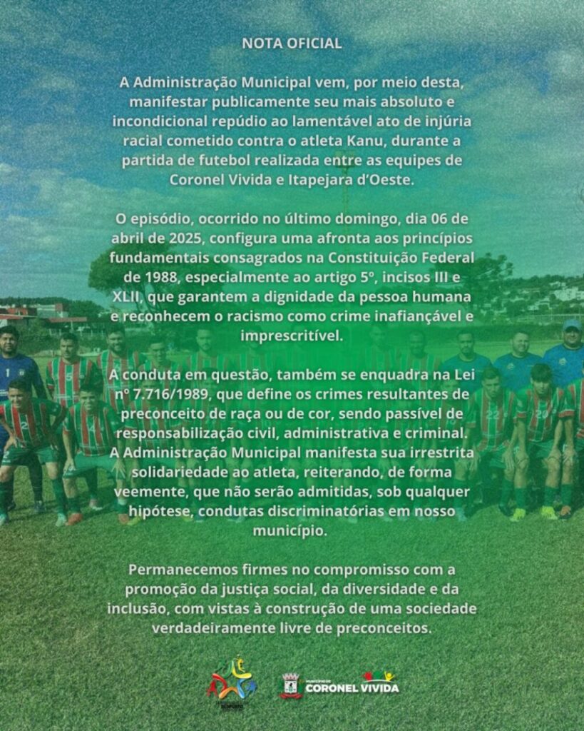 A Administracao Municipal vem, por meio desta, manifestar publicamente seu mais absoluto e incondicional repúdio ao lamentável ato de injúria racial cometido contra o atleta Kanu, durante a partida de futebol realizada entre as equipes de Coronel Vivida e Itapejara d’Oeste.