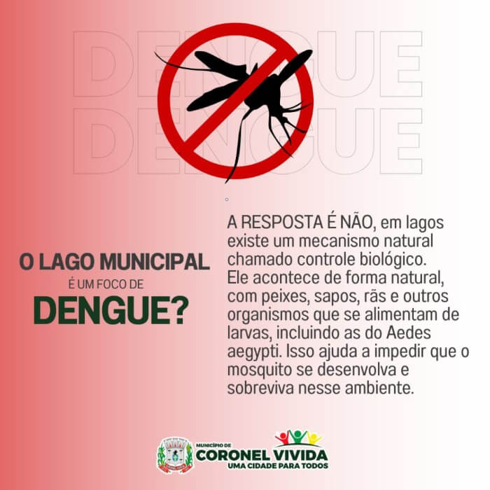 A Administração Municipal por meio da Vigilância Sanitária vêm a público informar e garantir que nenhum dos lagos é foco de dengue. Há alguns dias, recebemos indagações sobre os lagos serem possíveis locais de proliferação do mosquito Aedes Aegypti, o que não é verdade. Nos três lagos, há o controle biológico, que é feito por rãs, peixes, libélulas e outros organismos vivos que impedem o desenvolvimento as larvas do mosquito.
