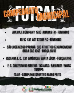 Confira todos os jogos do final de semana nos cards. E fique atento(a) que nessa semana tem mais Campeonato Municipal de Futsal.