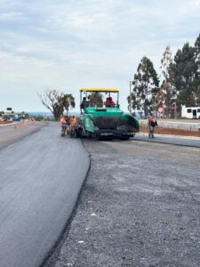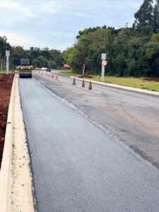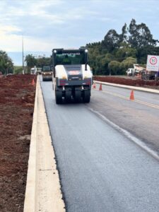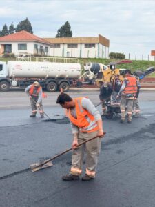 A implantação da massa asfáltica chegou ao trevo de acesso à rua Romário Martins.