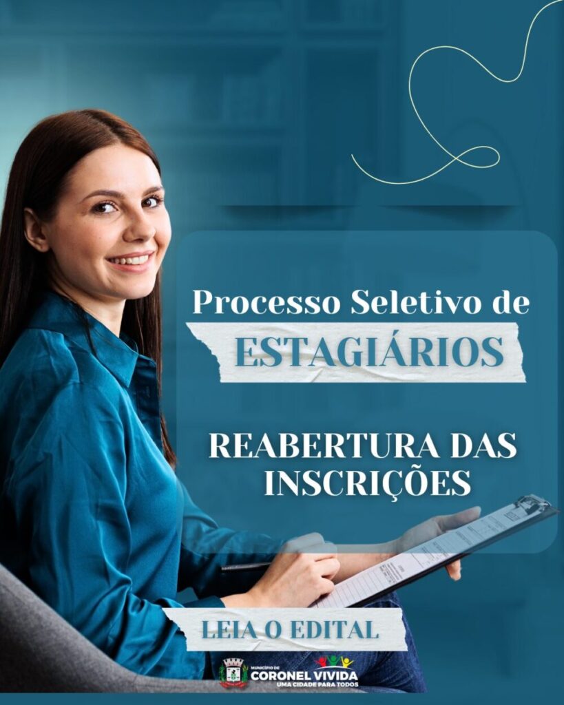 O Prefeito Municipal de Coronel Vivida, Estado do Paraná, usando de suas atribuições legais, considerando o subitem 2.8 do Edital nº. 001/2024 de 11/01/2024 abertura do certame “Em havendo necessidade de recrutamento de novos estagiários, poderão ser abertos pela Administração Municipal novos períodos de inscrição”, resolve tornar público para conhecimento de todos, o novo período de inscrição do processo de Seleção de Estagiários para algumas áreas específicas, o processo de seleção, avaliação e convocação atenderá os dispositivos constantes no edital de abertura do certame Edital nº. 001/2024 de 11/01/2024. E a reabertura das inscrições aos estudantes que se inscreveram para o Processo de Seleção de Estagiários, no período de 24/02/2026 à 27/02/2026, e que estão na condição de eliminados, para que possam regularizar essa situação caso queira, poderão protocolar e entregar a documentação que faltou.