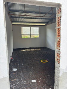 Nova sala de aula em construção e rampa de acesso à quadra esportiva;