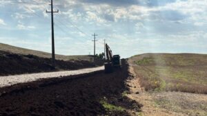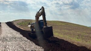 Neste primeiro momento, a máquina está abrindo as valas para implantação das galerias de aguas pluviais, um serviço essencial para a organização dos trabalhos e maior durabilidade da via.