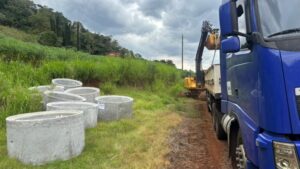 Neste primeiro momento, as máquinas estão fazendo a limpeza das margens e descarregando os tubos para instalação das galerias de águas pluviais.