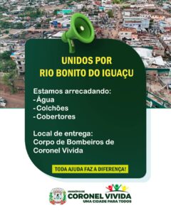Por meio da Secretaria de Assistência Social, da Defesa Civil do Município de Coronel Vivida e em parceria com o Corpo de Bombeiros, estamos realizando uma campanha de arrecadação, com foco em água potável, cobertores e colchões.