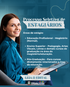 O Prefeito Municipal de Coronel Vivida, Estado do Paraná, usando de suas atribuições legais, especialmente as contidas no art. 37 da Constituição Federal, na Lei Federal nº. Lei nº. 11.788, de 25 de setembro de 2008, e tendo em vista o disposto no Edital de Seleção de Estagiários nº. 001/2024 de 11/01/2024, considerando o subitem 2.8 do Edital nº. 001/2024 de 11/01/2024 abertura do certame “Em havendo necessidade de recrutamento de novos estagiários, poderão ser abertos pela Administração Municipal novos períodos de inscrição.”