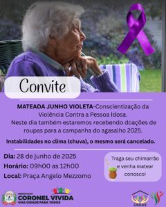 No dia 28 de junho, próximo sábado, a partir as 9h, haverá a tradicional mateada em alusão ao Junho Violeta, mês de conscientização da Violência contra a Pessoa Idosa.